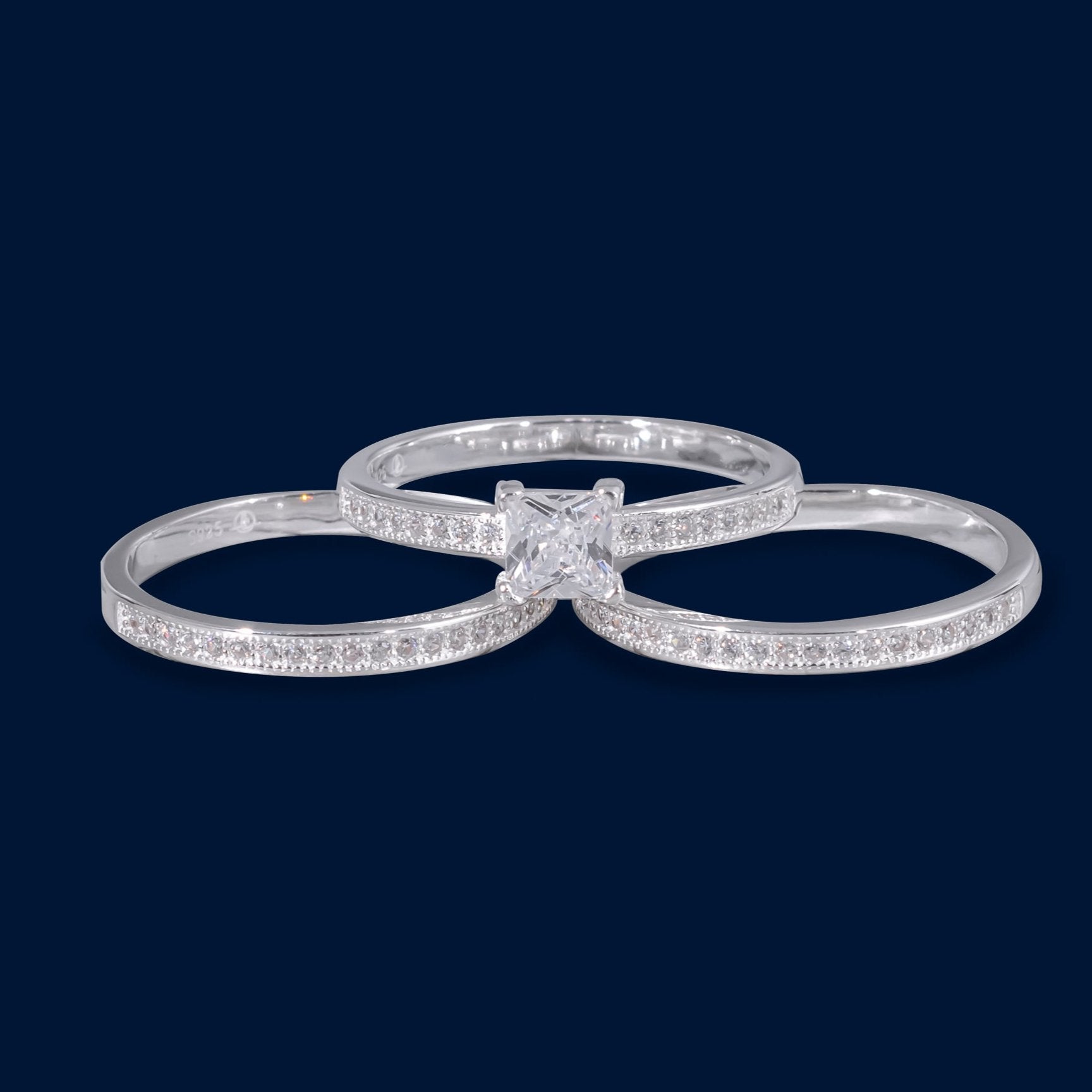 ¡Acepta el desafío del amor con nuestra Alianza Triple De Matrimonio/Compromiso De Plata! Hecho de plata de alta calidad, esta alianza ofrece un símbolo duradero de un amor eterno. Haz una promesa valiente y comienza una nueva aventura con esta alianza única.