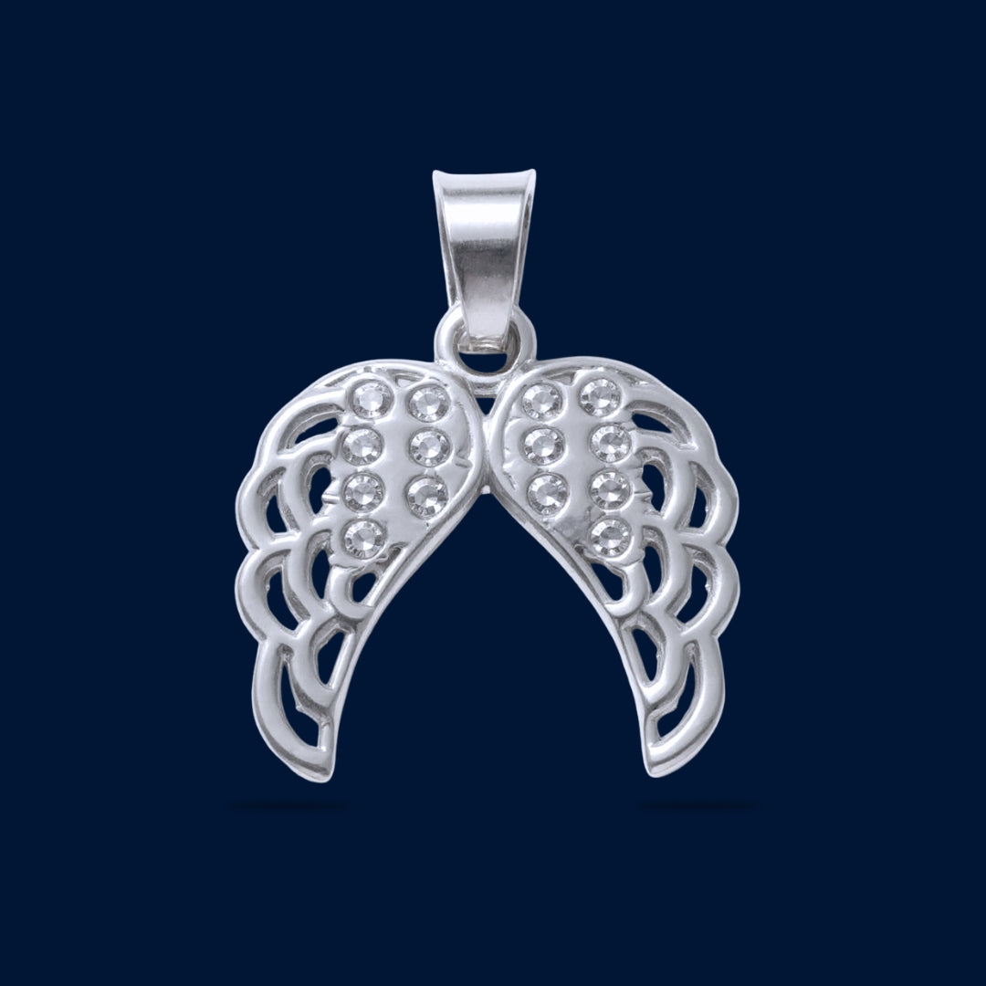 Este dije de plata, presenta un diseño elegante de alas de ángel adornadas con zirconia, que aporta un brillo sutil y sofisticado. Su acabado en plata garantiza durabilidad y resistencia, mientras que la delicadeza del diseño lo convierte en una pieza ideal para quienes buscan un accesorio con significado y estilo refinado. Perfecto para complementar cualquier atuendo con un toque de distinción y simbolismo.