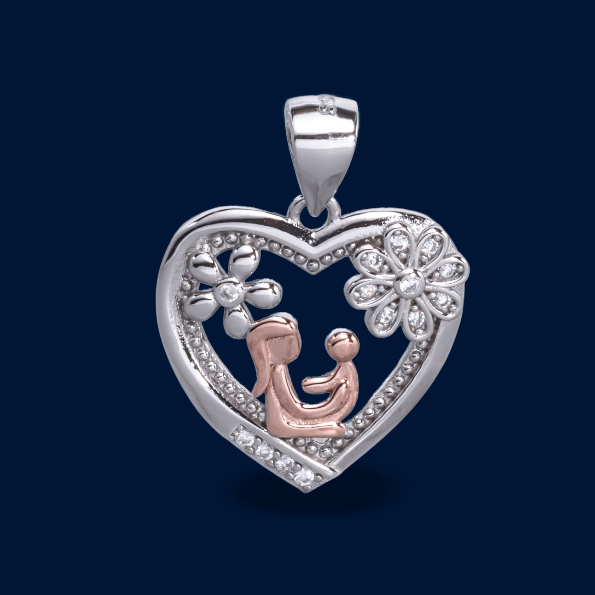 #D430 - Dije Corazón Mamá Y Hijo/a Flor Y Piedra Zirconia Baño Rodio Plata - IP2.3