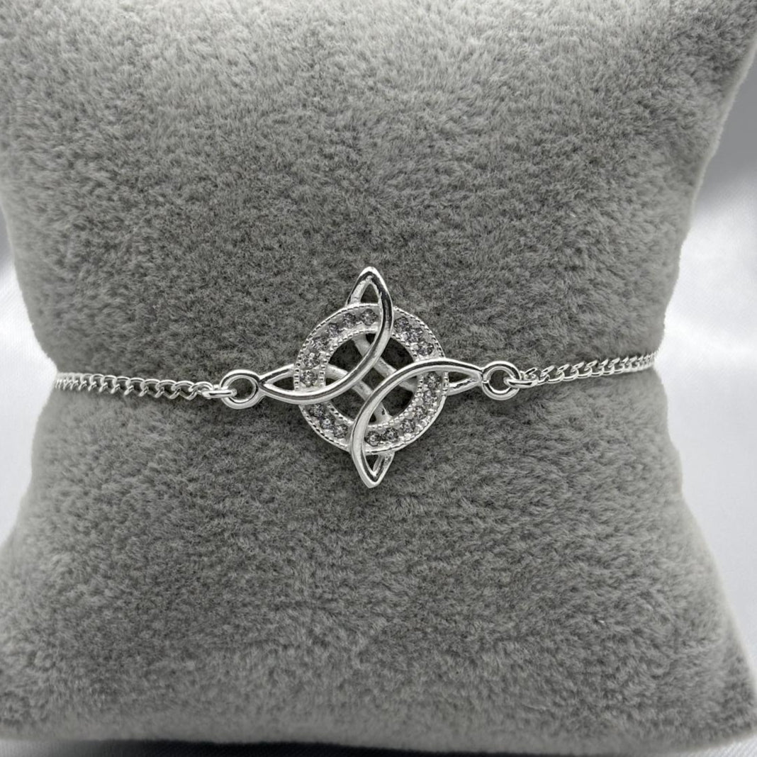 Esta elegante pulsera hecha de plata 925 está adornada con un hermoso dije nudo de bruja que brilla con piedras de zirconia. Combina la elegancia de la plata con la belleza de las piedras para un accesorio sofisticado y llamativo. Perfecto para cualquier ocasión.